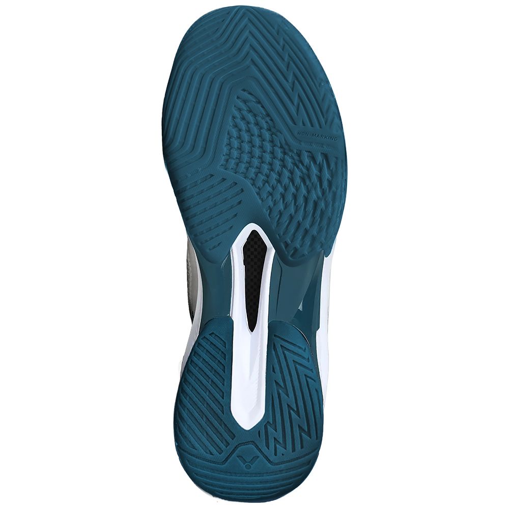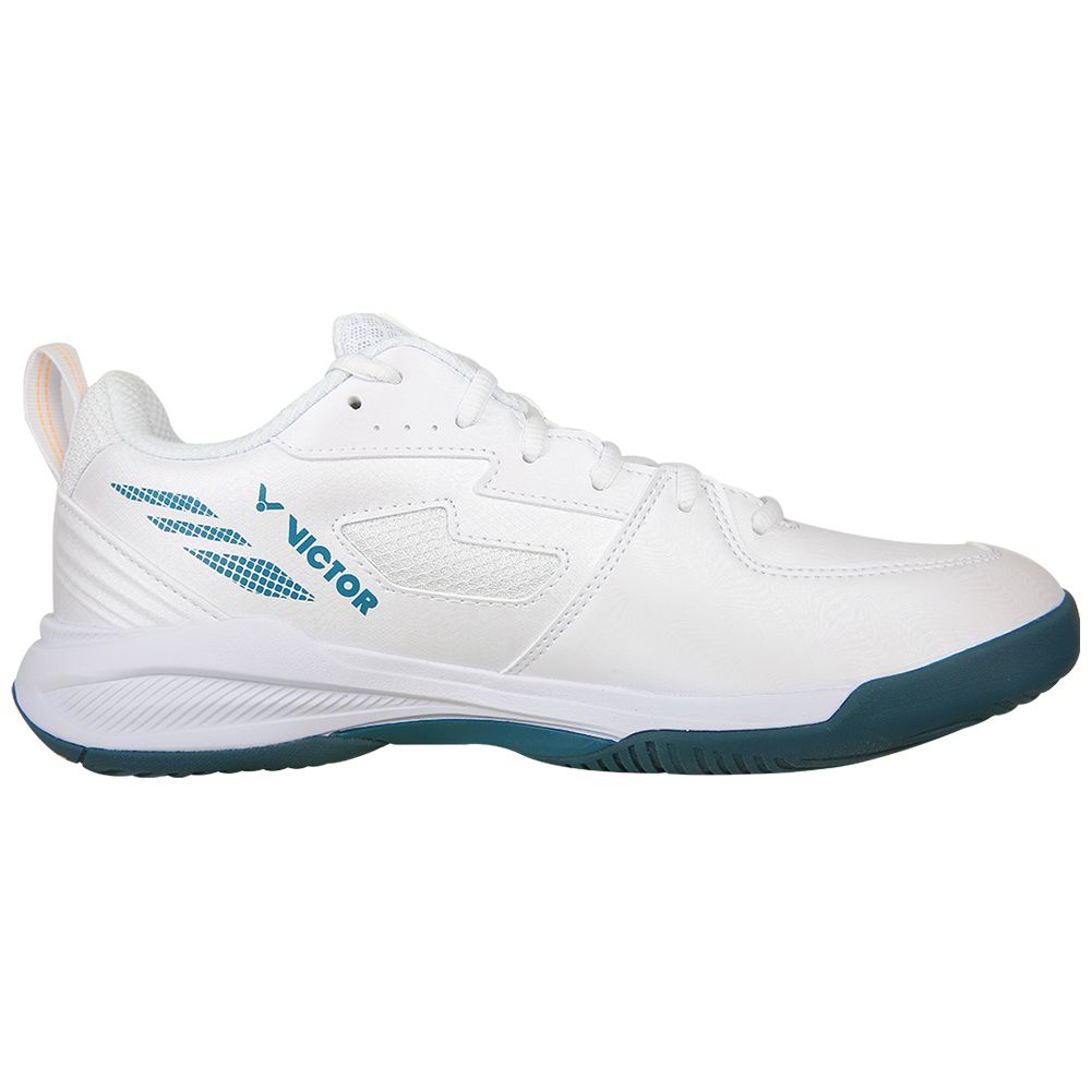 Assurez-vous une polyvalence et un confort idéal avec les chaussures de badminton Victor A690 AG Homme, d'un design mixant blanc à des touches de vert-de-gris.