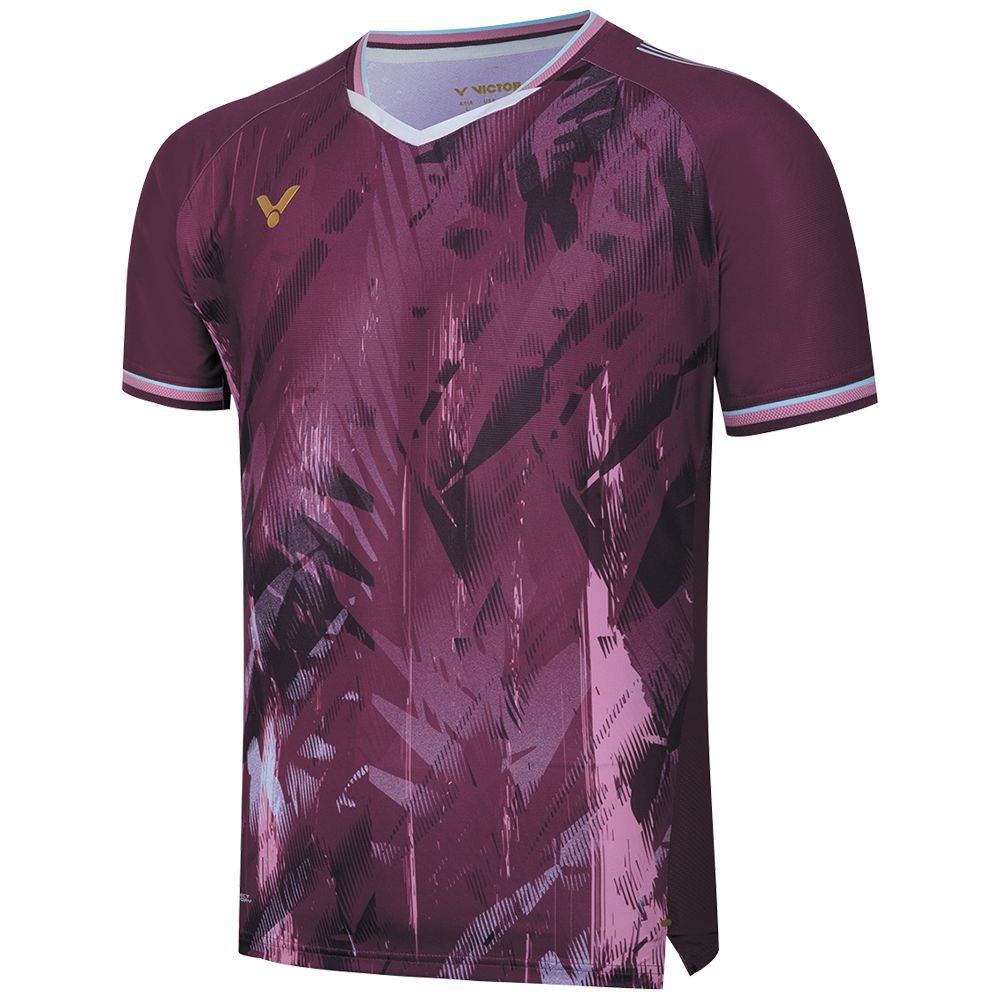 Bordeaux, ce tee-shirt Victor arbore le logo de la marque taïwanaise en poitrine, sous une couleur dorée. En plus des liserés blanc et rose entourant le col, d'autres s'ajoutent au bout des manches afin d'apporter une élégance supplémentaire à votre tenue.